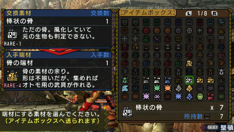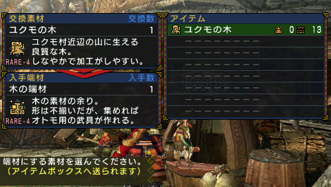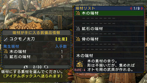 プレイヤーの装備を生産、加工したときに出る、素材の余り。オトモ武具は、基本的に「端材」とお金で生産することが可能になる。