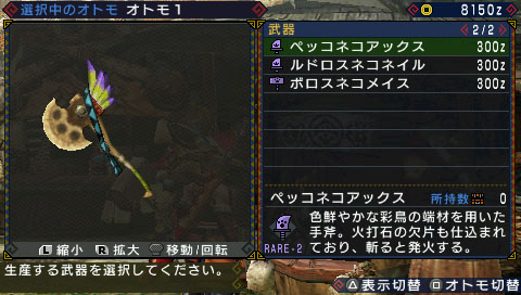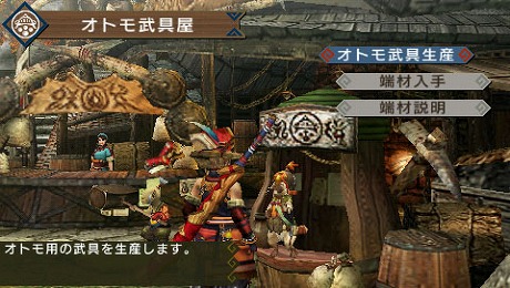 プレイヤーの装備を生産、加工したときに得られる「端材」を材料にして、オトモアイルーの装備を生産することができる。またアイテムを「端材」と交換することも可能。