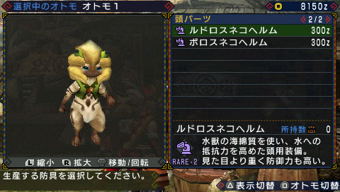 装備可能部位は,武器と頭パーツおよび胴パーツの3か所。プレイヤーの武具と同様に,異なる性能を持った多数の“オトモ武具”が登場するようで,討伐対象によってオトモアイルーの装備を変更して戦う,といった楽しみ方が考えられる。